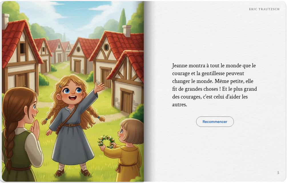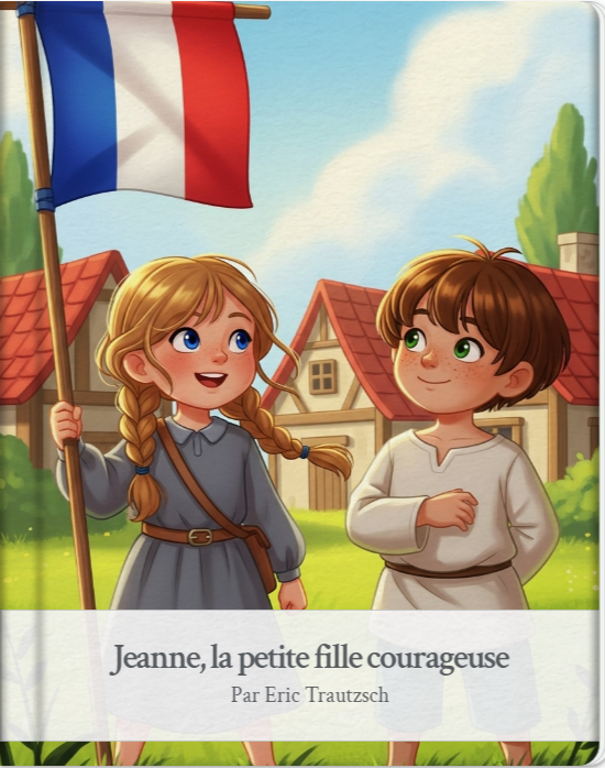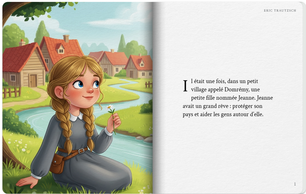 Le livre d'histoires que j'ai créé s'appelle "Jeanne, la petite fille courageuse" et raconte l'histoire simplifiée de Jeanne d'Arc, une petite fille qui fait preuve de courage et de persévérance pour aider son pays, avec des objectifs pédagogiques axés sur l'éveil historique et les valeurs pour un public cible de 5 ans.